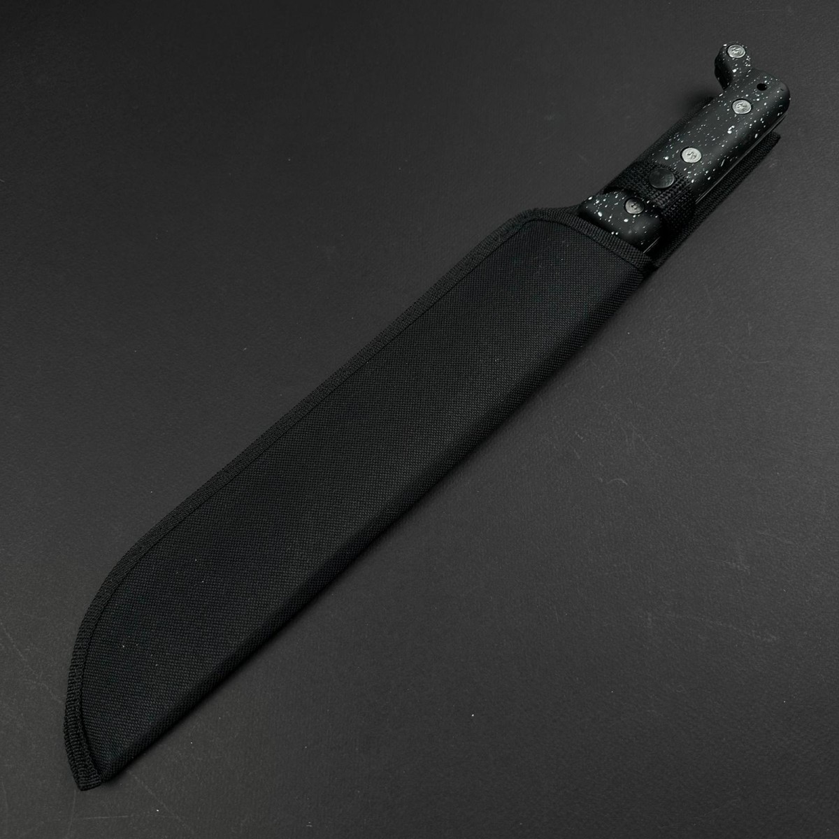 Macetă / cuțit cu lama fixa lunga, design tip Bowie / macetă tactică, ideal pentru camping heavy-duty, bushcraft avansat, supraviețuire în natură, clearing teren, pregătire lemne sau vânătoare ușoară. Lama de 30 cm cu curbă agresivă oferă putere excelentă de tocare, despicare și tăiere largă, fiind perfectă pentru vegetație, ramuri, lemn mic-mediu sau tranșare grosieră. Aspectul tactic dur și modern vine de la finisajul negru mat al lamei, mânerul ergonomic texturat negru (aderent excelent în condiții umede / murdare) și teaca textilă rezistentă cu prindere la centură sau rucsac.