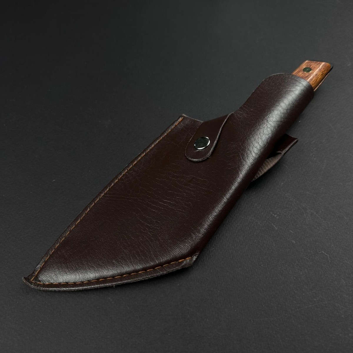 Cuțit cu lamă fixă tip satăr / chopper curb artistic – lamă 16 cm oțel inoxidabil, mâner lemn maro, total ~26 cm, cu teacă piele sintetică.