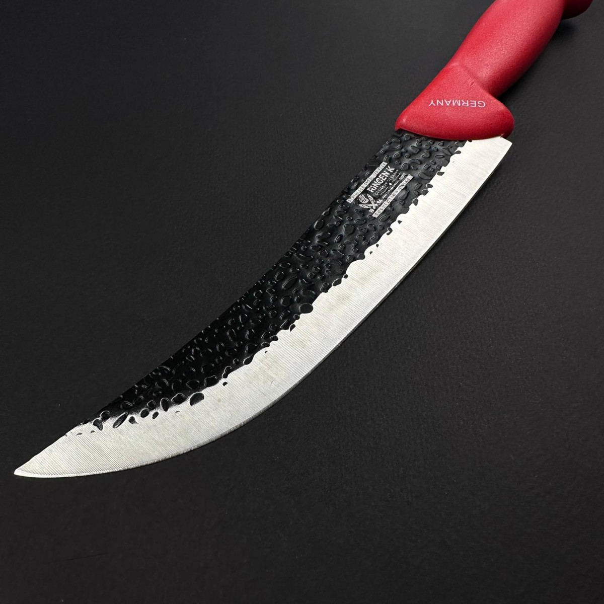 Cuțit bucătarului (chef knife) profesional, cel mai versatil și folosit cuțit în bucătărie, conceput pentru tăiere, feliat, tocare și tranșare în orice activitate culinară sau de măcelărie ușoară. Lama lată, lungă și robustă de 20 cm permite atât lucrări rapide de tocare (legume, carne, ierburi), cât și feliat precis sau tranșare bucăți mai mari. Aspectul autentic și rezistent provine de la finisajul texturat al lamei din fier forjat (efect martelat clasic) și mânerul ergonomic din ABS rosu intens, rezistent la umezeală, grăsimi și alunecare.
