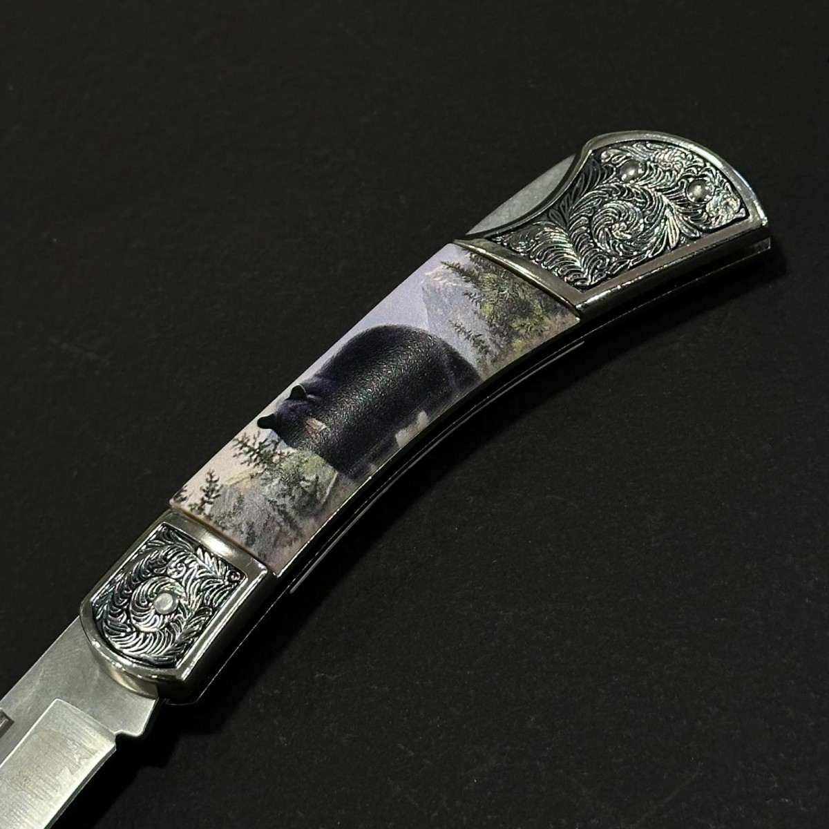 Cuțit briceag camping Anima Urs negru 2 19cm, lama otel inox, mâner imprimeu, ANIM-URS19BLK2
