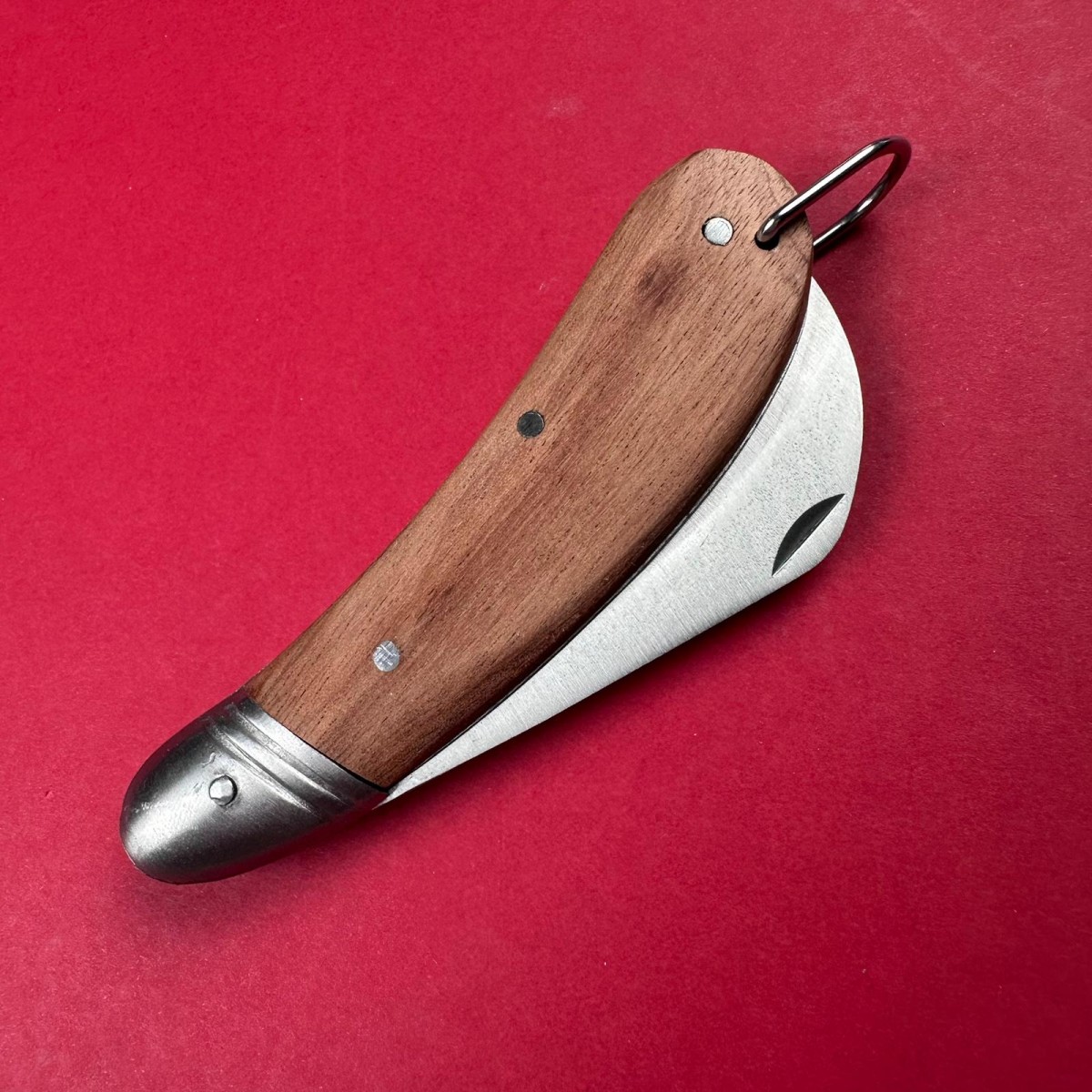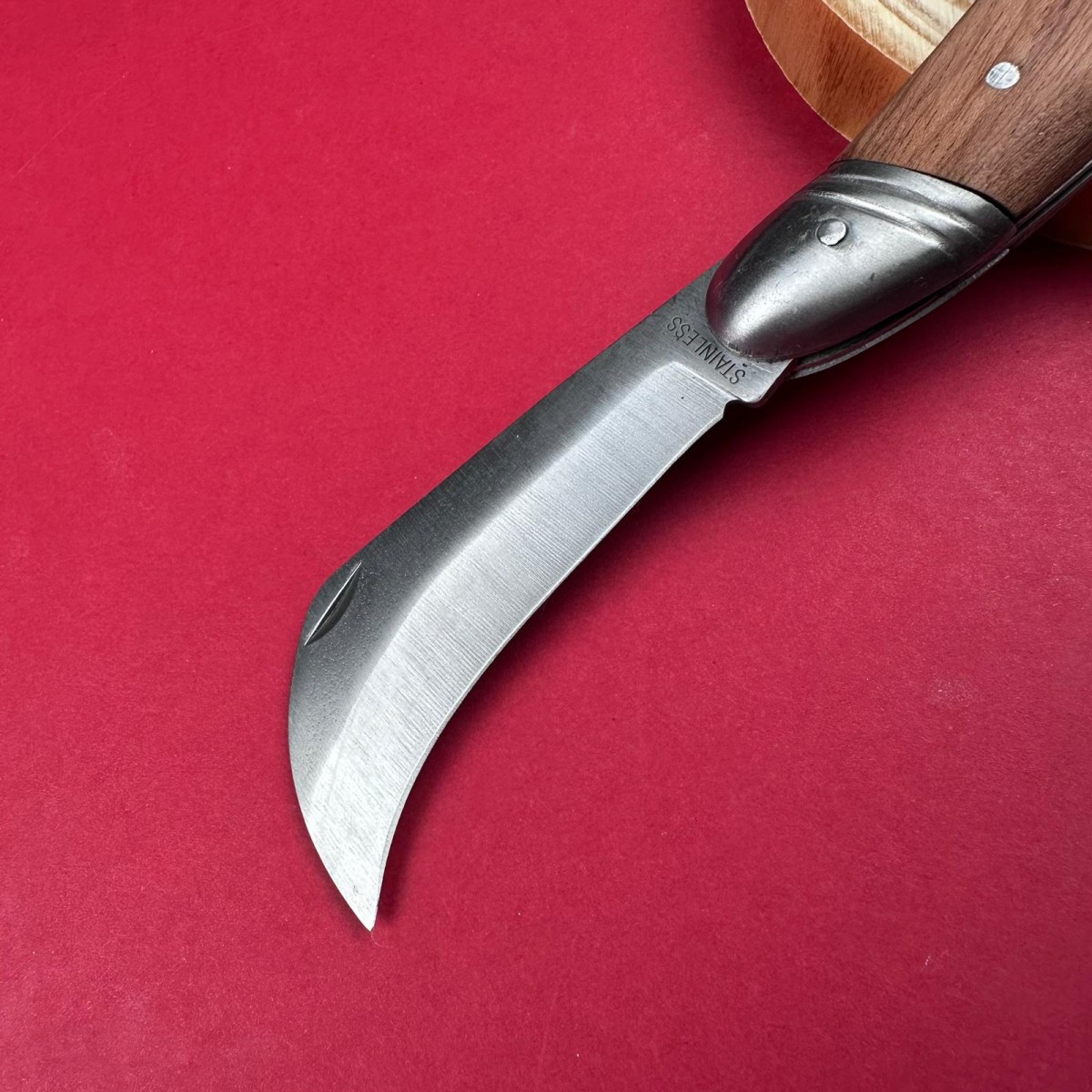 Cuțit pliabil pentru altoit și camping – lamă 6.5 cm inox curbă, mâner lemn maro, total deschis 19 c..