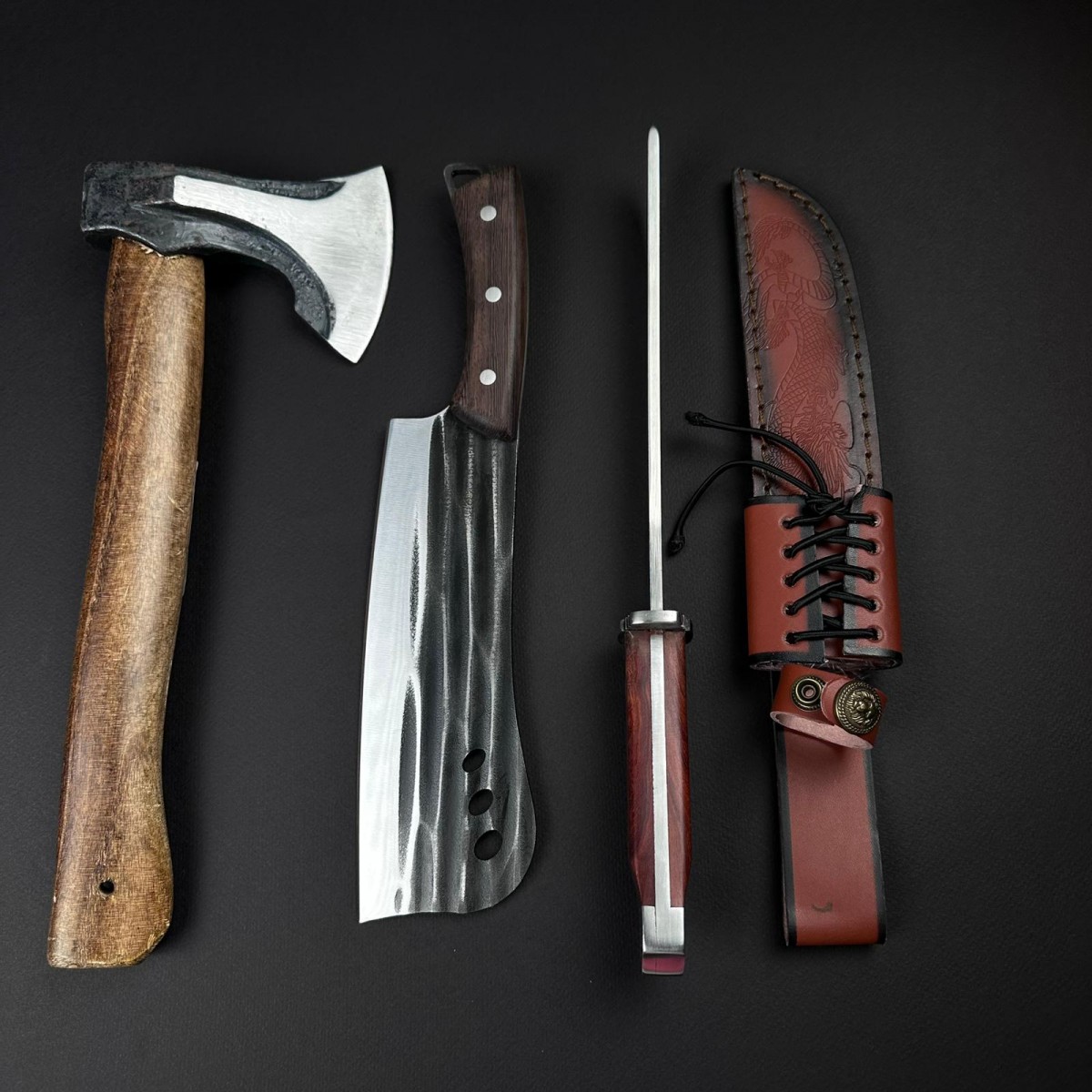 Set hobby 3 piese, Toporisca 34cm, Cutit tip Maceta fier forjat si Cutit tip Bowie cu husa piele gravata, set1
