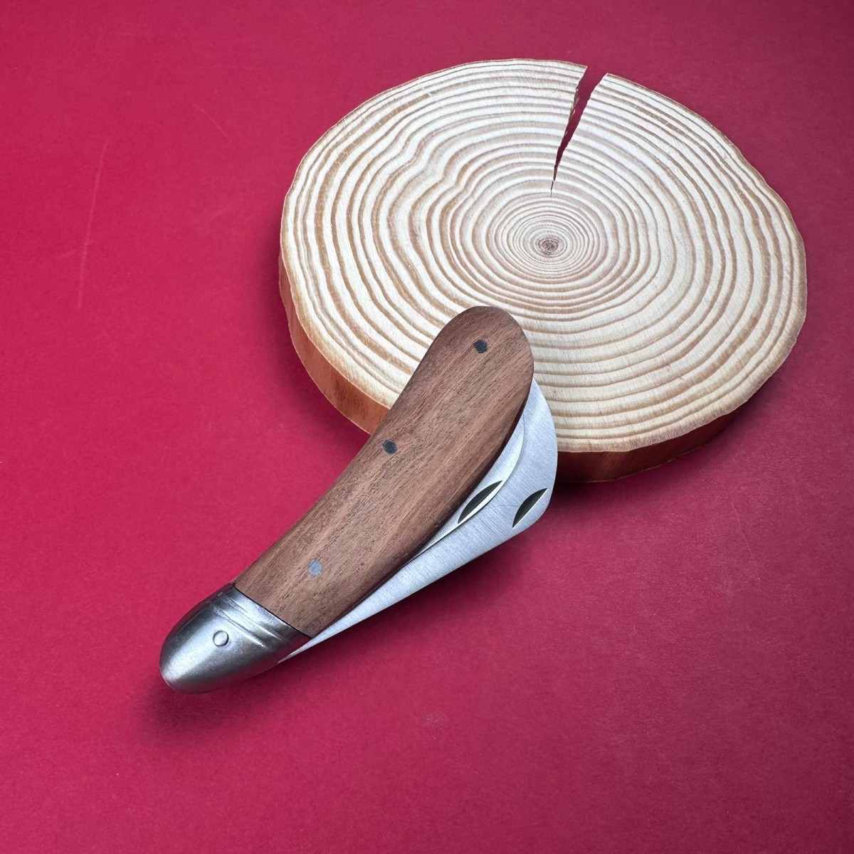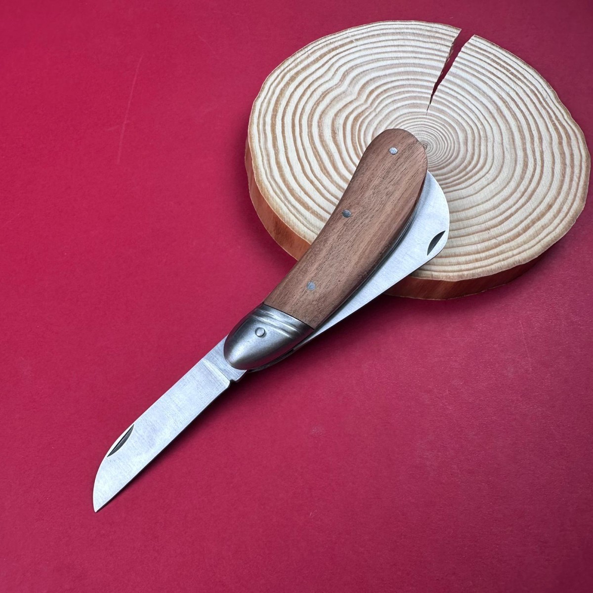 Cuțit pliabil pentru altoit cu lamă curbă tip cioc – lamă 7 cm inox, mâner lemn maro, total deschis ..