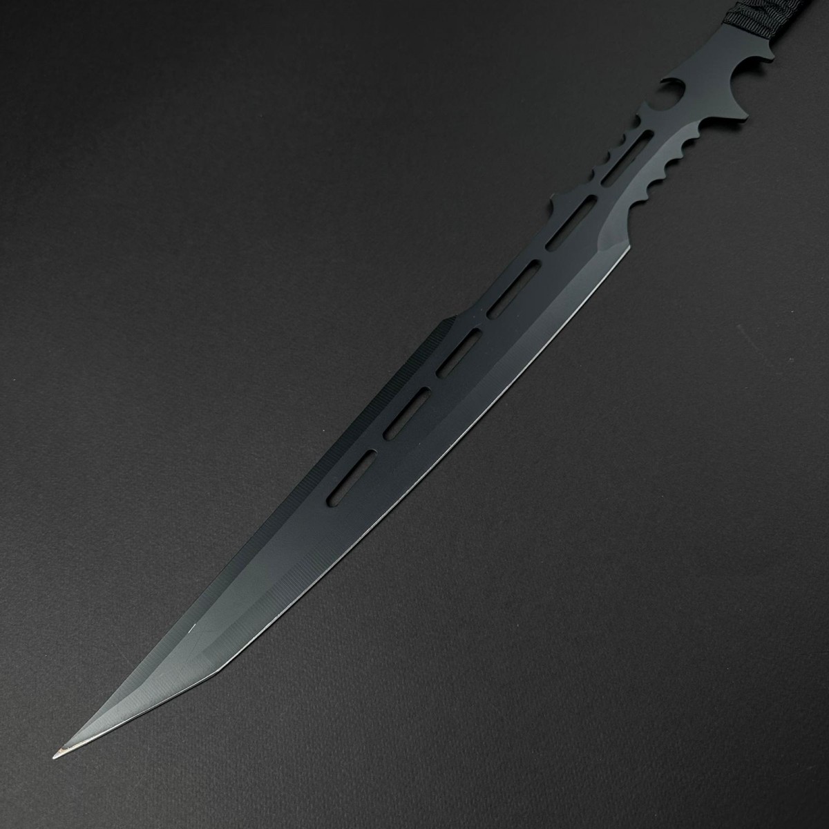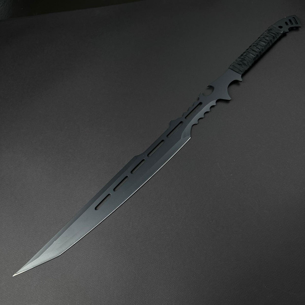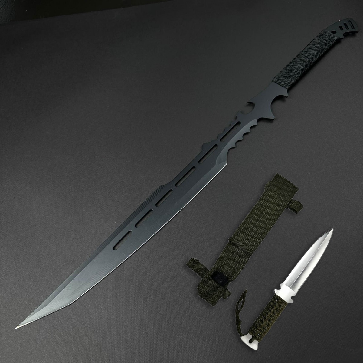 O sabie / cuțit impresionantă și multifuncțională – lama extrem de lungă combinată cu mânerul paracord și husa textilă o fac un tool esențial pentru situații extreme în natură, oferind putere maximă de tocare și versatilitate reală.