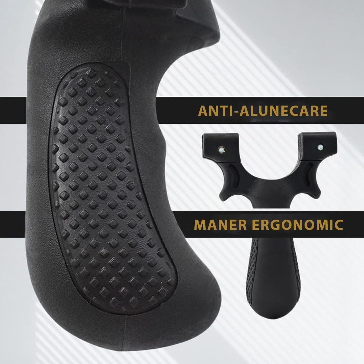 - Mâner: texturat antiderapant, formă anatomică, zonă de prindere cu degetul arătător și police pentru stabilitate maximă
