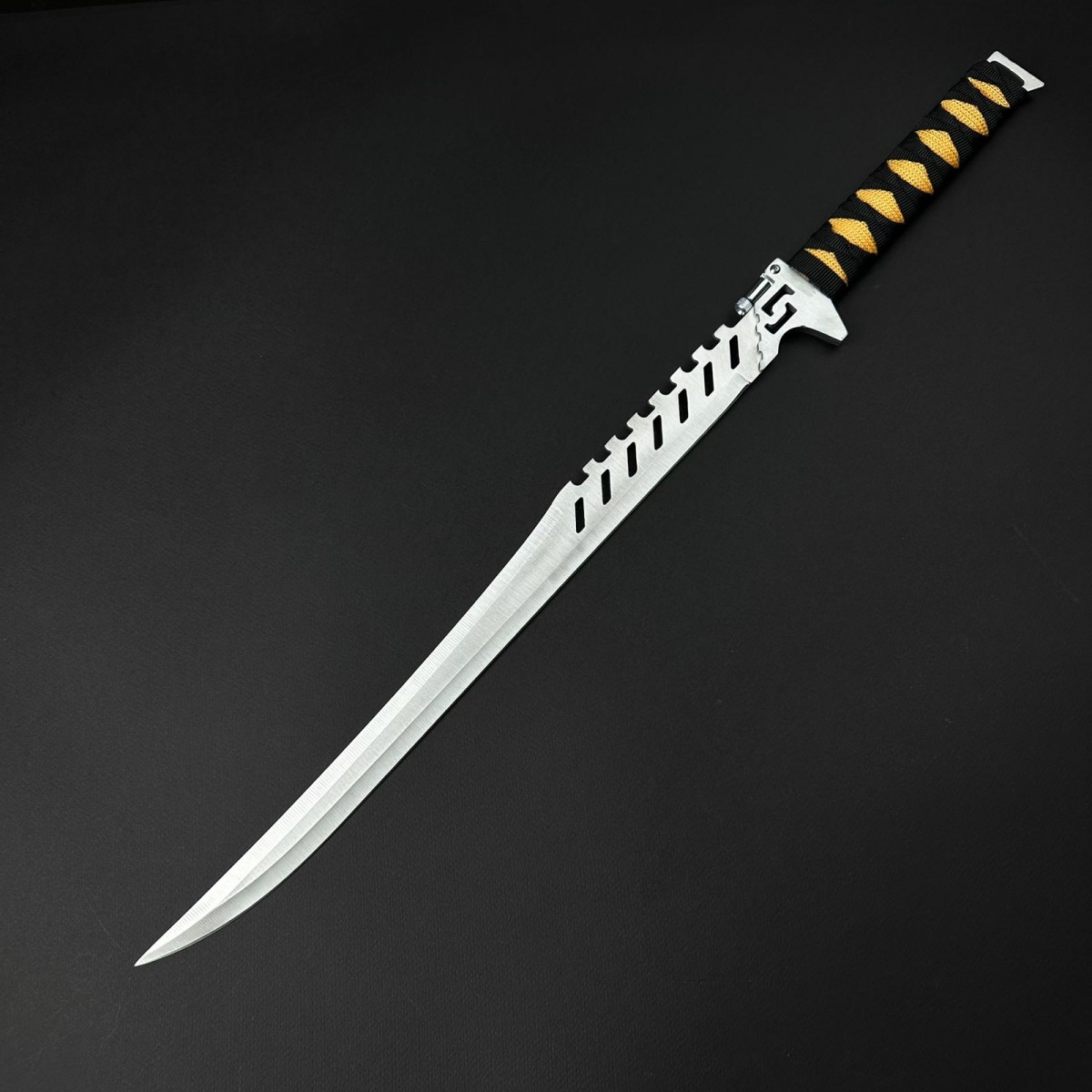 O sabie / cuțit impresionantă și multifuncțională – lama foarte lungă cu dublu tăiș combinată cu mânerul paracord și husa textilă o face un tool esențial pentru situații extreme în natură, oferind putere maximă și versatilitate reală.