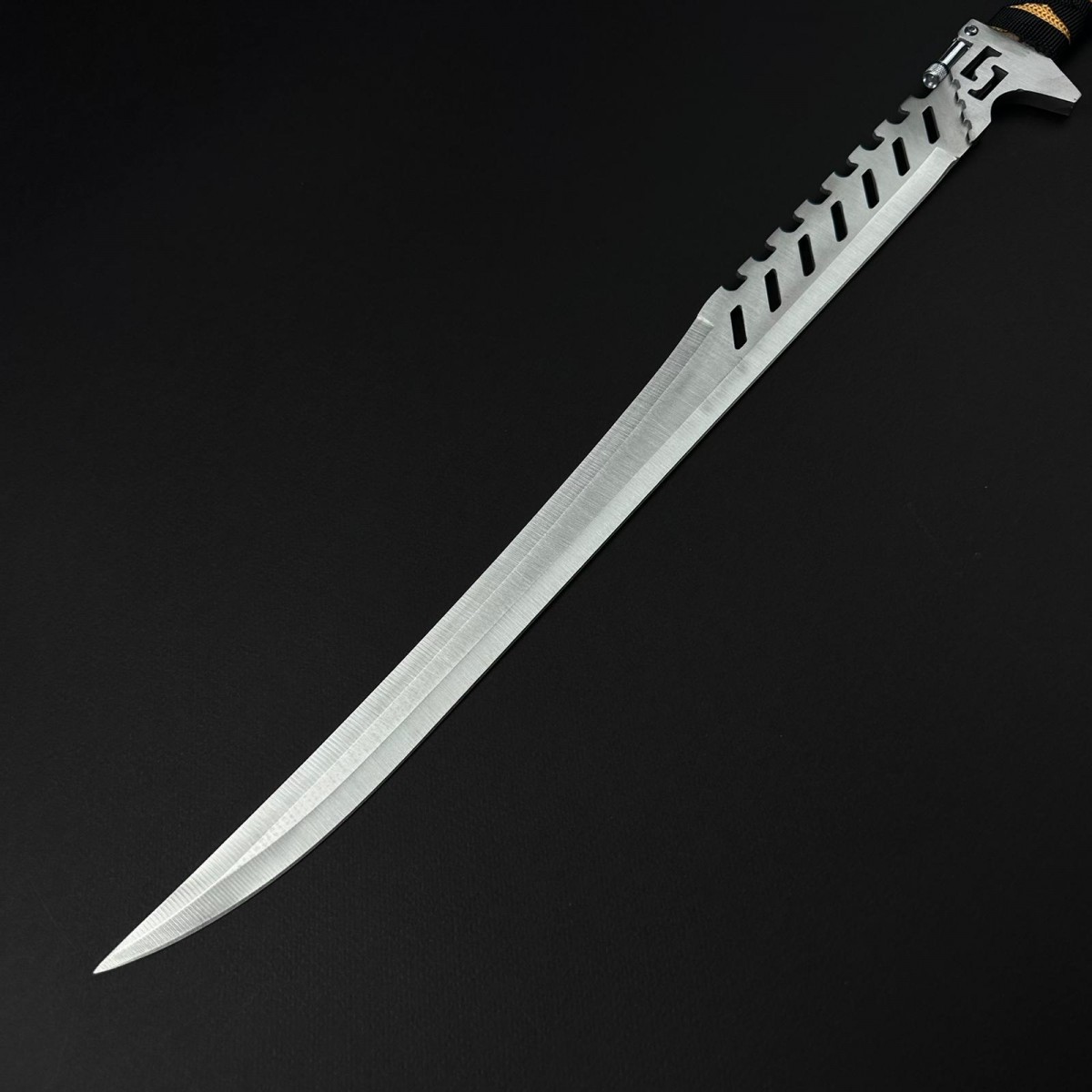 - Formă lamă: tip Bowie lung cu dublu tăiș asimetric, vârf extrem de pătrunzător, curbă agresivă și decupaje tactice pentru reducere greutate și aspect intimidant