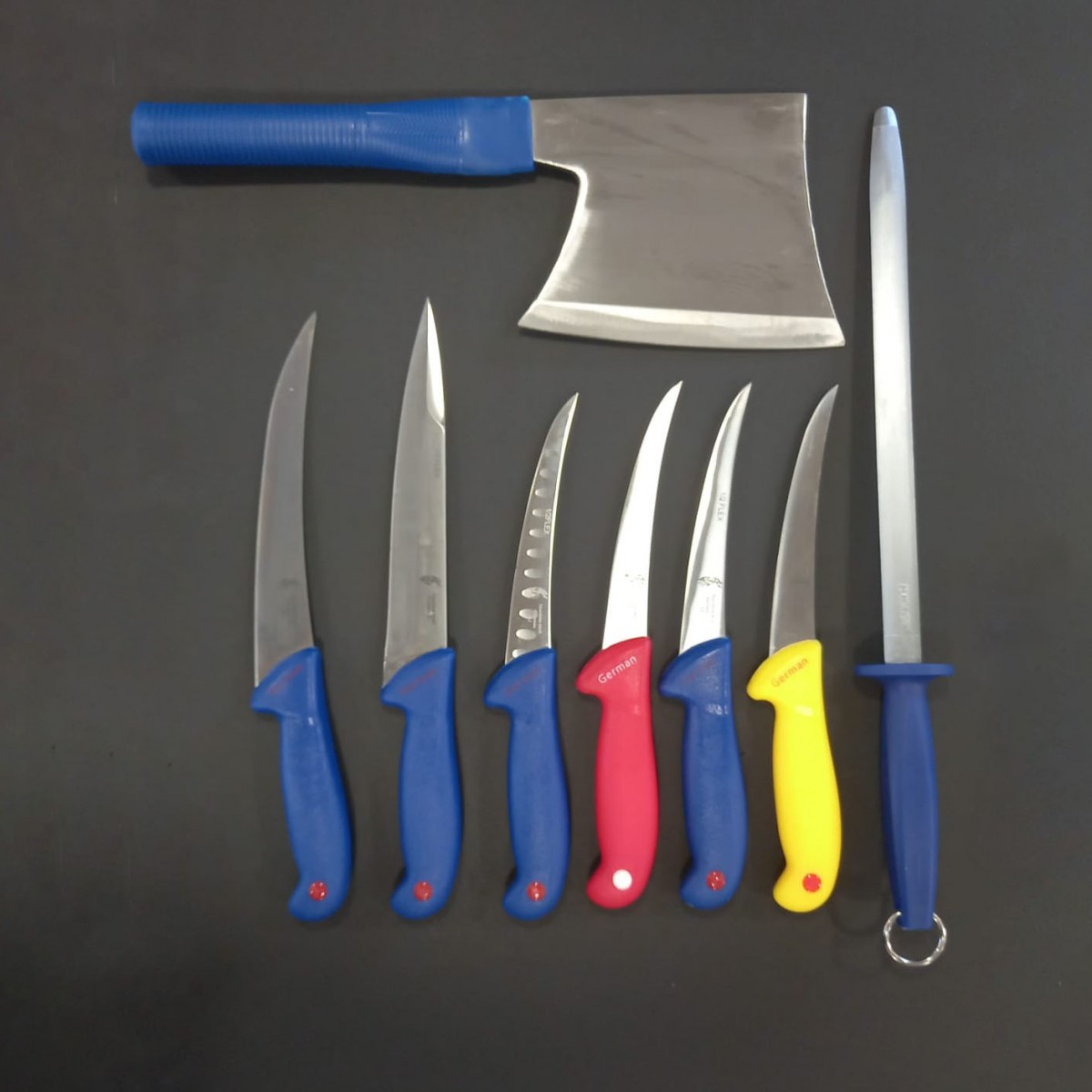Set profesional german de 8 piese pentru măcelărie și prelucrarea cărnii. Include un satar solid pentru tocare, 6 cuțite specializate (cu vârf dublu tăiș, pentru tranșat, filetat și cu caneluri) și o pilă profesională pentru ascuțit. Toate cuțitele au lamă din oțel inoxidabil de calitate, iar mânerele colorate (albastru, roșu, galben) oferă priză sigură și vizibilitate bună în bucătărie sau abator. Setul este conceput pentru utilizare intensă zilnică, fiind ideal pentru măcelari, bucătari profesioniști sau pasionați de prelucrare carne acasă.